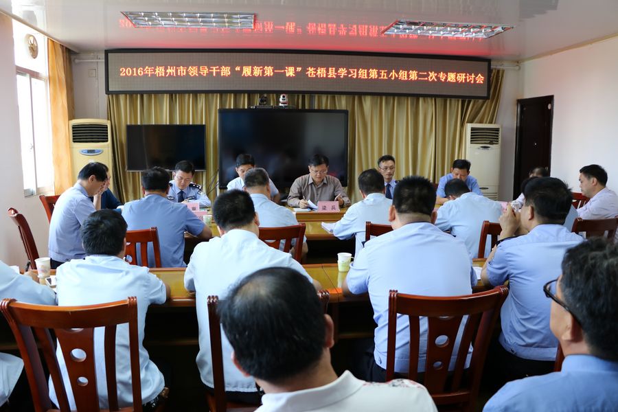11月1日,2016年梧州市领导干部“履新第一课”苍梧县学习组第五小组在县委政法委召开第二次专题学习研讨会,以学习研讨“班子建设与决策机制、廉政建设与担当作为”为主题。会议由县委常委、政法委书记梁兵同志主持,副县长、县公安局局长杨创新、县法院院长潘家绪、县检察院检察长金兆军、县公安局政委邹冀等领导参加了研讨会。